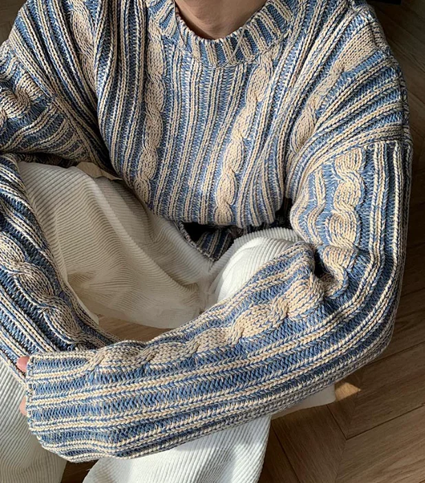 Retro color-blocking round neck casual knit sweater