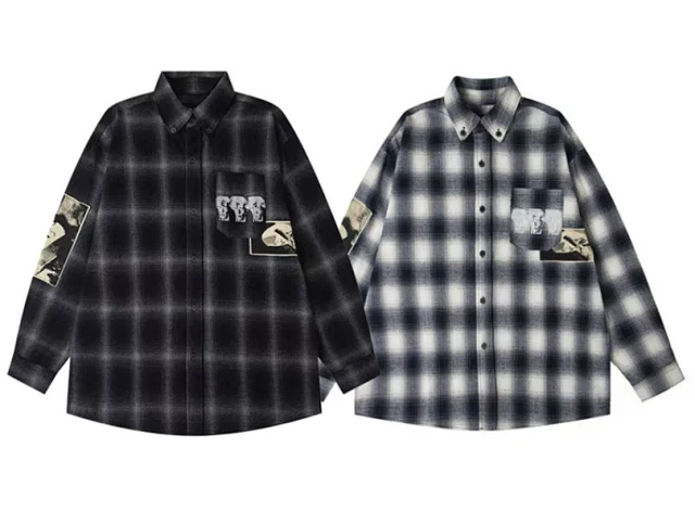 Plaid button pocket letter loose long sleeve shirt