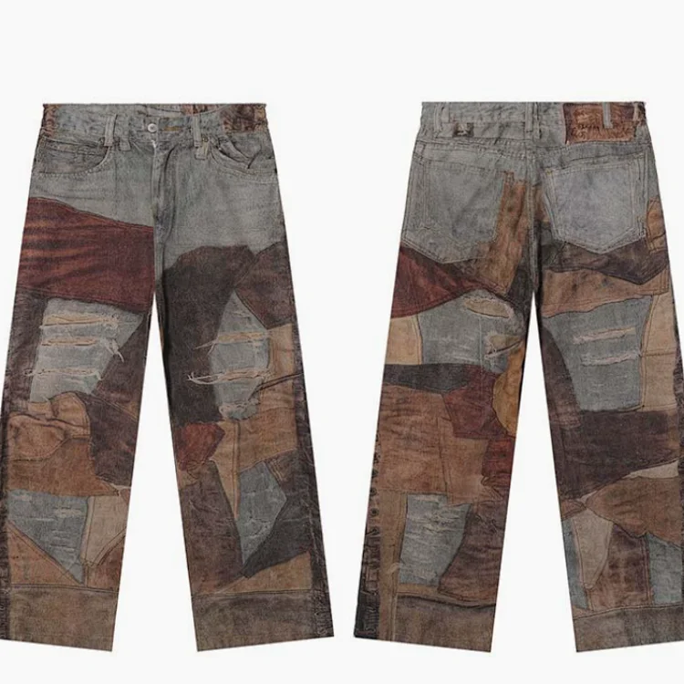 3D trompe l'oeil distressed patch patchwork printed straight jeans