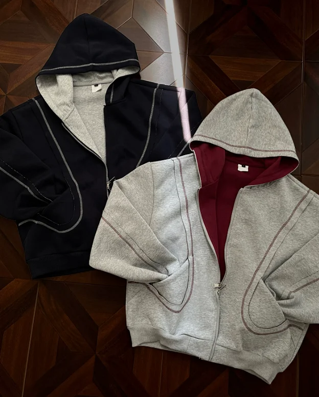 Couple's casual loose retro gray hooded sweatshirt jacket